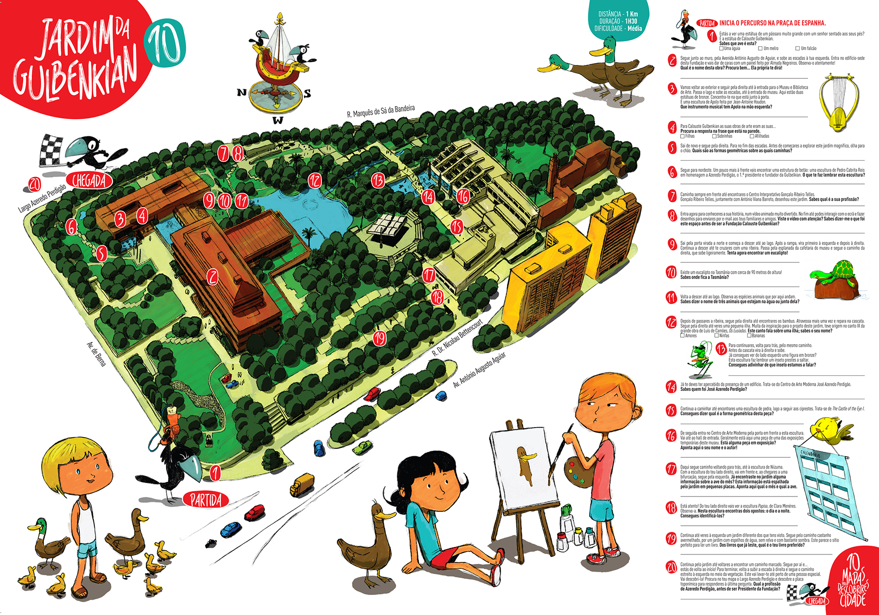 Belém; Da Casa dos Bicos ao Castelo; Chiado; Da Graça a Santa Clara; Do Príncipe Real à Glória; Dos Restauradores ao Marquês de Pombal; Do Cais do Sodré à Praça do Comércio; Jardim da Estrela; Do Carmo à Baixa e Jardim da Gulbenkian são os dez mapas que irão orientar as famílias (portuguesas ou não) que queiram conhecer a cidade e dela se apropriarem enquanto passeiam. Alegremente.