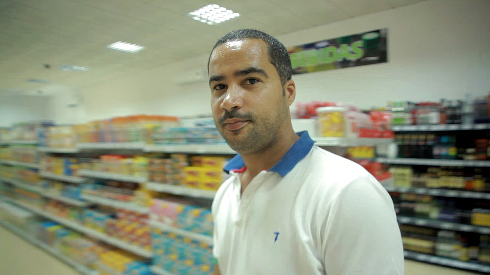 Chegamos ao Ponto Alimentar, um supermercado todo branco: chão, paredes, prateleiras. Há um talho, zona de frutas e legumes, arcas frigoríficas fechadas com os frescos lá dentro. Em obras e equipamentos, o supermercado tem um investimento de cerca de um milhão de euros, algo que em Portugal custaria uns 250 mil, diz Marco Neves.